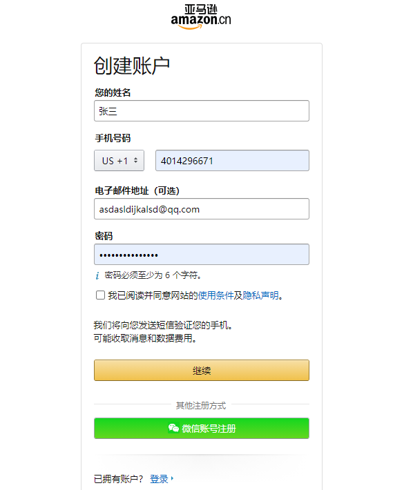 4.在你想要使用的地方,例如注册亚马逊,先选择手机号所属国家,再填写手机号。经过测试,在无法选择手机号所属国家的网站,大概率无法接收验证码。