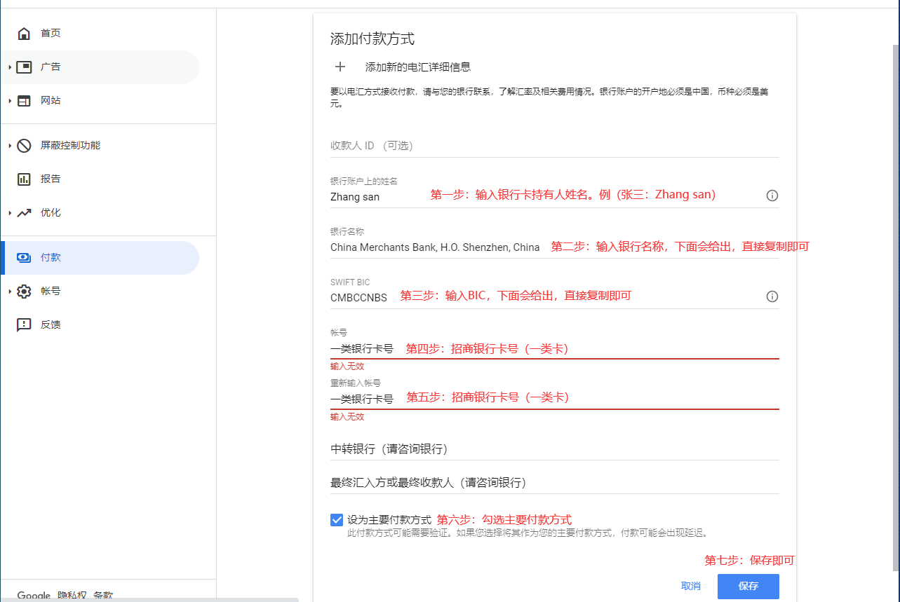 在前几年,接收谷歌广告联盟(Google AdSense)的汇款一般都是使用西联,但是谷歌去年彻底关闭了西联收款方式,这就使国内的站长不得不寻找新的收款方式,办法总比困难多,目前大家都开始使用招商银行来接收谷歌的电汇,它的好处就是没有任何手续费,谷歌给多少到你手里就是多少,有些银行则会扣取一些钱作为中转银行的手续费。