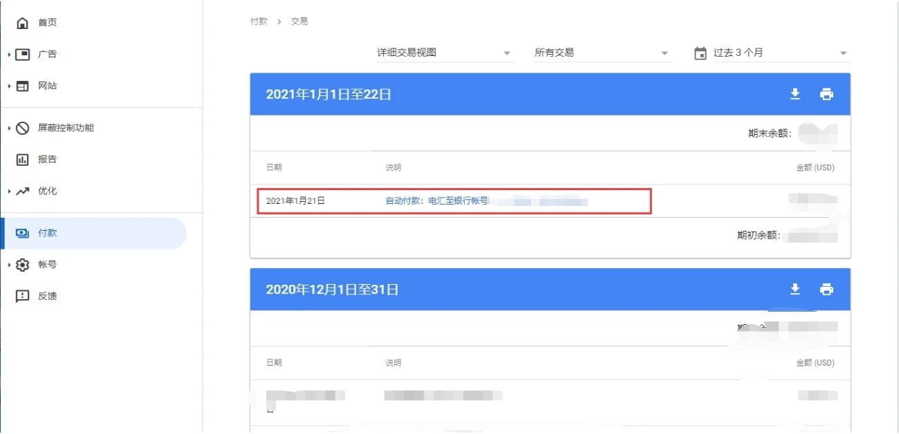 第四步:等待账户满100美金,谷歌进行自动付款,一般是21号傍晚开始