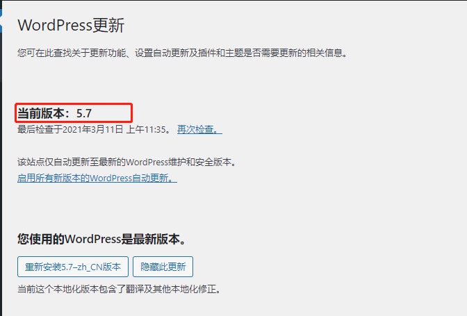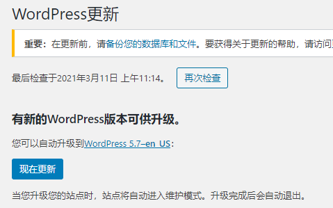 3.再次进入升级页面,点击现在更新按钮,等待等待等待等待,不久后就会显示本次程序更新成功,本站也成功升级为WordPress5.7。