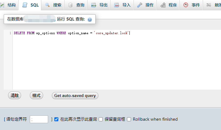 1.先执行下方SQL语句,删除wp_options表中的core_updater.lock锁定记录,不然无法再次执行更新程序,我的数据库管理工具为phpMyAdmin,其他数据库管理工具的操作基本一样。