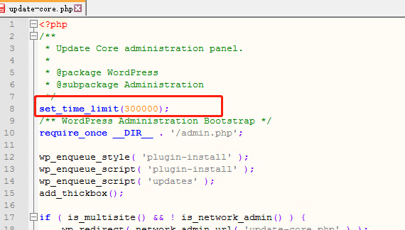 2.进入服务器网站程序根目录,然后找到\wp-admin\update-core.php文件,加入下方代码防止因为远程程序包下载超时导致500报错。