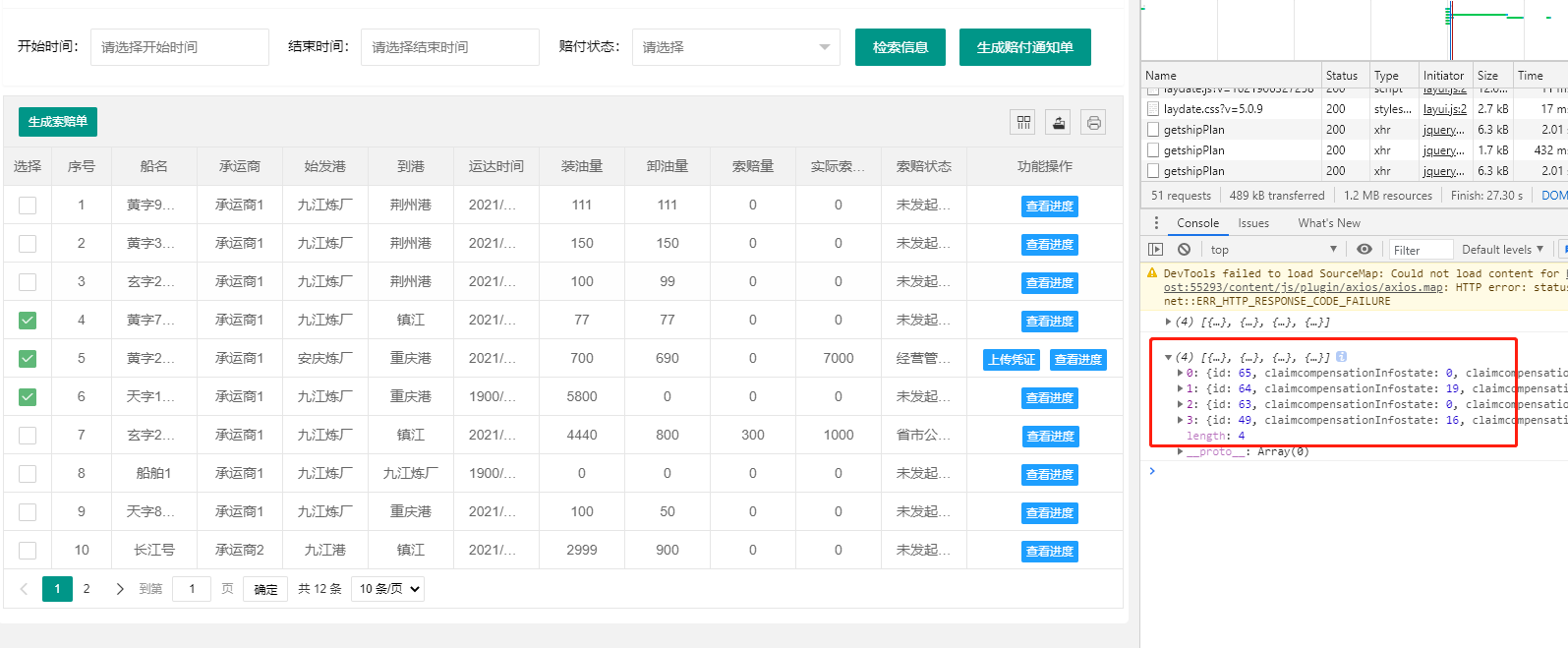 3.回到第一页自动勾选之前选中的三条数据,然后点击输出目前选中的数据,在控制台打印出来四条数据,完美实现该功能