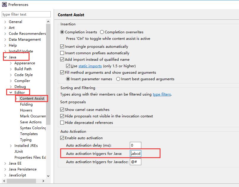 第二步,在左侧菜单栏依次选择Java=》Editor=》Content Assist=》Auto Activation triggers for Java=》在文本框中输入.abcdefghijklmnopqrstuvwxyz等26个英文字符=》点击保存即可
