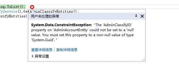 C#中的GUID数据类型与数据库中的uniqueidentifier数据类型是对应的,但是C#中的GUID是不接受空值的,而数据库的uniqueidentifier却接受空值,所以在开发过程中可能会出现类似下图的这种报错信息,大意就是某字段为空,必须设置该字段为GUID的非空值。