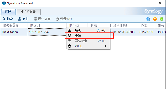 1.在synology-assistant工具上扫描到nas信息后,选中右键选择安装,并接受NAS协议。