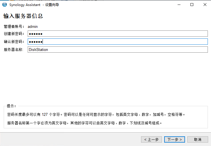 3.输入NAS服务器信息,密码和服务器名称随意填写,把密码记住就好