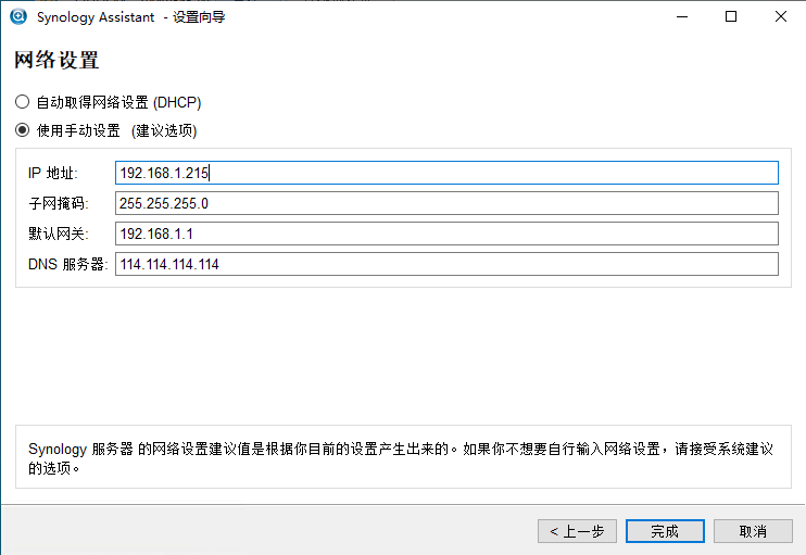 4.输入NAS网络设置,这里一定要注意记好IP地址,安装成功后NAS默认地址就是你设置的(IP:5000)