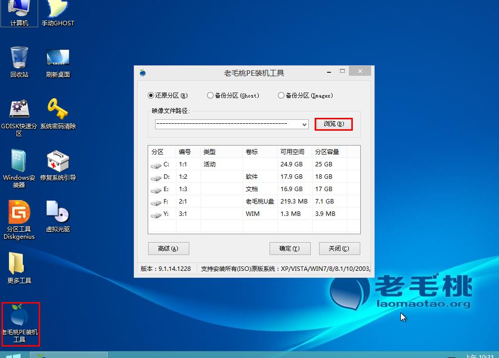 2、登录pe系统后,鼠标左键双击打开桌面上的老毛桃PE装机工具,然后在工具主窗口中点击“浏览”按钮,如下图所示: