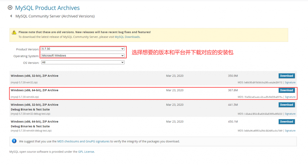 windows安装mysql数据库有多种方法,下面的方法是我认为比较简单快速的。首先,我们先下载官方的mysql安装包,各版本各平台安装包下载地址如下:点我直达