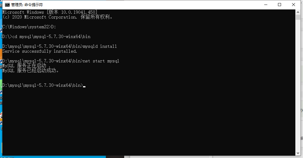 一切准备好之后进入命令提示符,一定要选择管理员权限进入,然后cd进入到mysql安装文件目录D:\mysql\mysql-5.7.30-winx64\bin,输入下面初始化指令