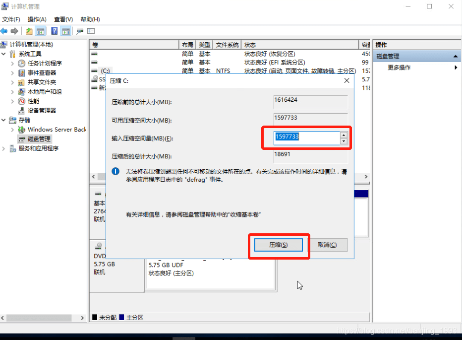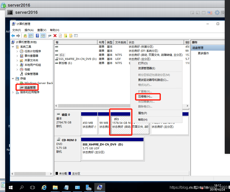 二、选择磁盘管理,选一块空间充足的盘,比如C盘,右键压缩卷,分配空间