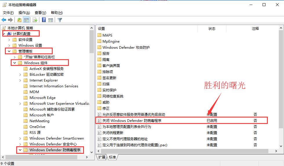 第二步:管理模板=》Windows组件=》Windows Defender防病毒程序=》关闭Windows Defender 防病毒程序