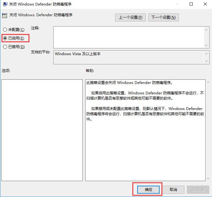 第三步:双击打开关闭Windows Defender防病毒程序,然后改为已启用,然后点击确认
