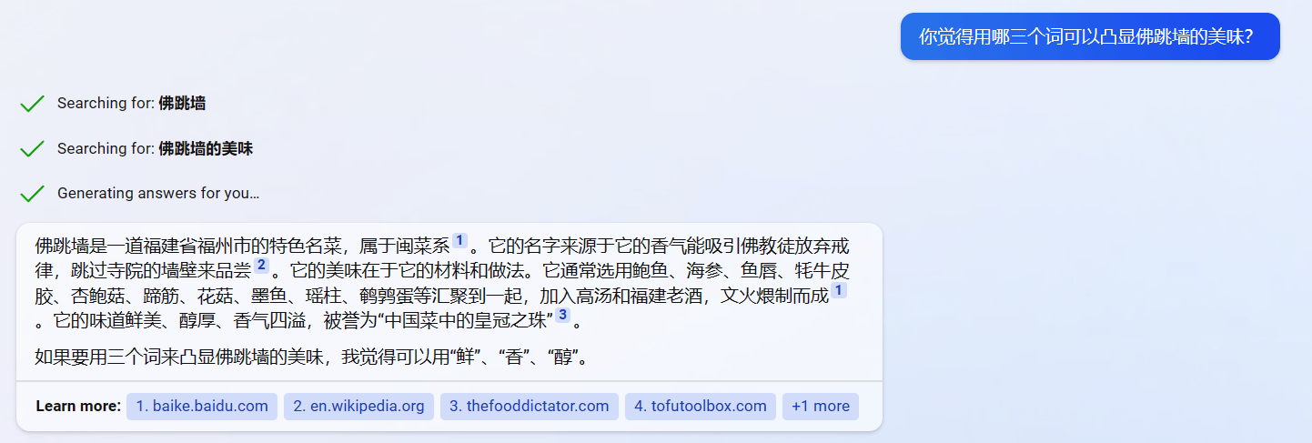此轮比拼 ChatGPT 和 Bing Chat 的回复侧重点不尽相同,ChatGPT 侧重于对“三个词”的描述,并做出解释,而 Bing Chat 侧重于对佛跳墙的介绍。相比来讲,如果想要直接的答案,ChatGPT 似乎做得更好。