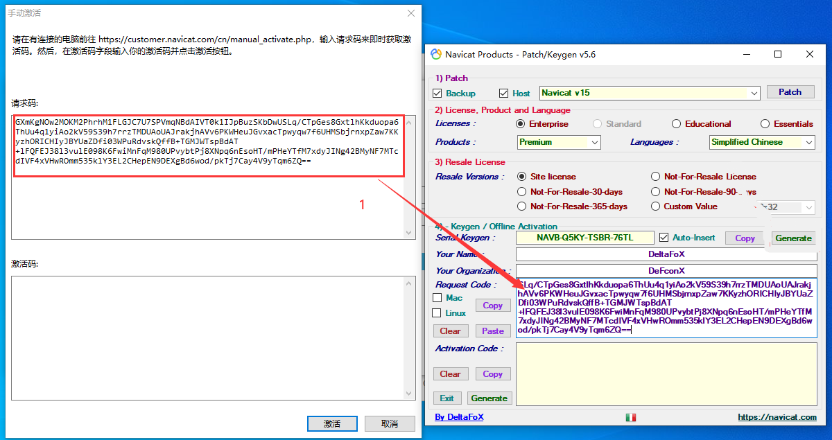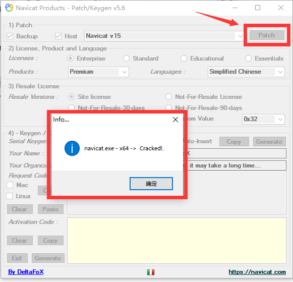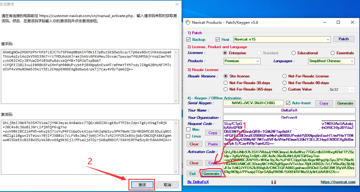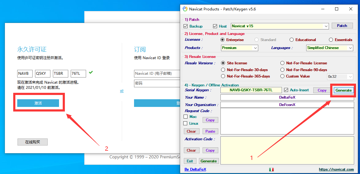 第六步:点击下图第一个箭头指向的Generate按钮,然后等激活码自动填充后点击激活按钮即可完成激活。