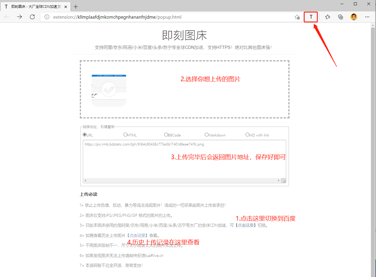 2.安装完毕后点击工具栏的T图标即可进入图床页面,先切换图床源地址到百度,接着上传你想存储的图片,然后会得到图片的网络地址,最后把这个网络地址存储好就行了。历史上传记录可以在下图第四步查看。