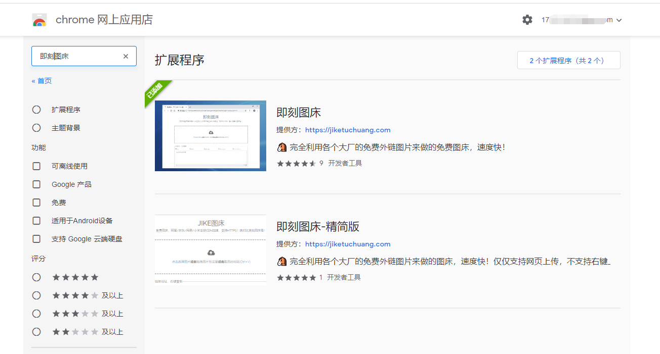 1.需要先爬墙进入谷歌软件商城,然后搜索即刻图床,选择搜索结果第一个进行安装,剩下的使用操作与Microsoft Edge的使用教程无差异,不再赘述。